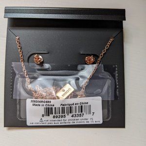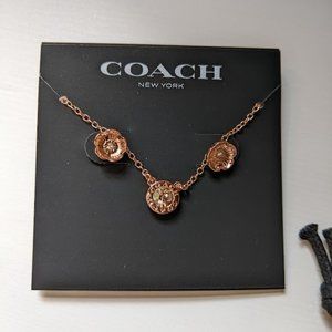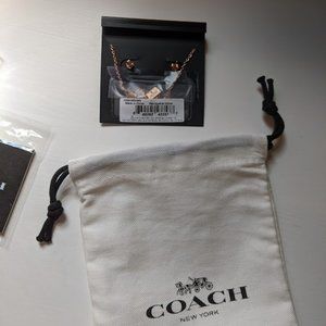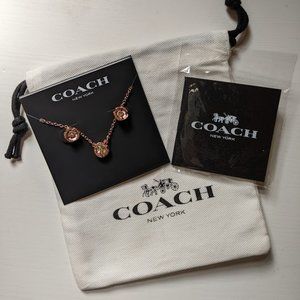 Brand new in packaging Coach tea rose earring and necklace set. The stud earrings are set in rose gold plated brass with a post back closure. The necklace is set in rose gold plated brass and embellished with a silk colored stone. "Coach" is engraved on the outer edge. It has a lobster clasp and is adjustable in length from 16-18". They come with a small booklet and a dust bag.