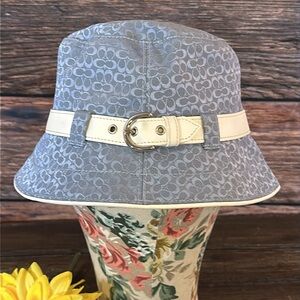 NWT! Coach Women’s Blue Logo Bucket Hat with White Leather Buckle! Size Small!