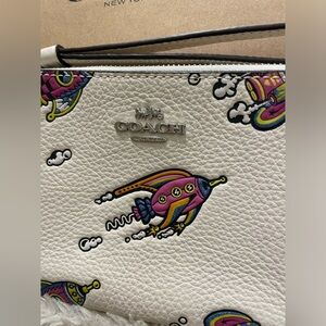 NWT Coach Wristlet Zip Rocket Patterned With Box. Brand new 2024 glitter rocket ship pattern, purchased from the storefront. Retail $138, see wristlet handle and slots inside pocket!