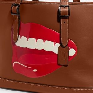 Coach pays homage to legendary New York City artist Tom Wesselmann with this playful, Pop Art-inspired collection. A modern design with a heritage feel, our Carriage Tote is a timeless style loaded with functionality. Secured by a zip closure, it features multifunction pockets for easy organization, space for a 16" laptop and adjustable handles for the perfect fit. The spacious style is crafted of our buttery soft glovetanned leather detailed with a bold, expressive lip motif.