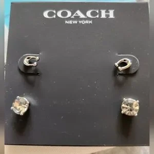 brand new, never worn. 2 pair- emblem stud and crystal studs with a gold tinge! Comes with cute coach drawstring bag.