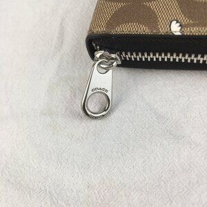 "This Coach x Peanuts collaboration wristlet features the iconic Signature brown canvas adorned with playful Snoopy prints, blending fun and fashion perfectly. Designed with a zip-around closure, it offers multiple card slots and compartments for coins—stylish and practical. Comes with the original Coach gift box, perfect for gifting or collecting.