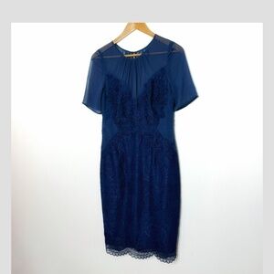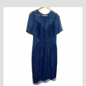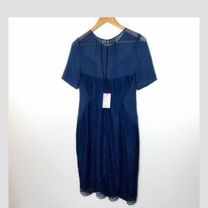 NWT Coast Cocktail Dress Combe Sheath Column Dress Navy Blue Lace Sheer Short Sleeve Size 8