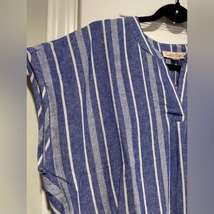 NWT Coastal Comfort Size M Blue Stripe Linen Blend Split Neck Short Sleeve Top
