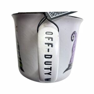 Large Halloween mug by Cobwebs & Cauldrons. Has 3 witch hats on each side and the handle says “Off Duty Witch" Inside is green and black checkered.