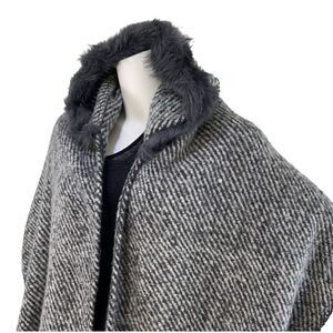 Description: hooded shawl with fringes and faux fur rimmed hood