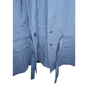 New with tags - two snap closure with tie. Stand collar or wear it open. Pretty powdery blue color.