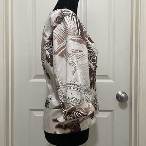 Add sophisticated charm to your wardrobe with this beautiful Coldwater Creek open front blazer in a striking white and brown abstract floral print. This women's size 12 petite jacket is new with tags and originally retailed for $119. Crafted from a high-quality blend of 98% cotton and 2% spandex, it offers a structured yet comfortable fit with just the right amount of stretch. It is fully lined in soft polyester for a smooth feel.