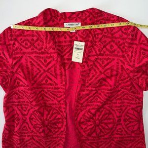 This open front jacket from Coldwater Creek is a perfect addition to your wardrobe. The red color with grey geometric patterns adds a touch of elegance and style to your outfit. The 100% cotton material ensures comfort and breathability, making it suitable for summer, fall, and spring seasons. The 3/4 sleeve length with casual sleeves and collared neckline makes it a versatile choice for travel, casual or workwear occasions. The petite size fits perfectly for those who prefer a regular fit. It is machine washable for easy care.