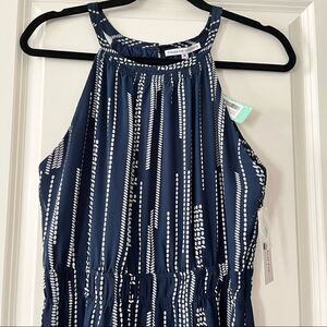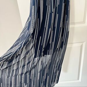 Brand new with tags! Beautiful navy and white abstract stripe print chiffon maxi. Has elastic waist, halter neckline with button loop closure. Hidden side zip. Lined to the knees. Flows beautifully! Light and airy!