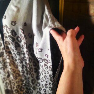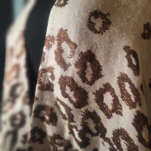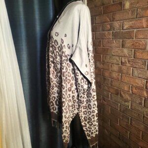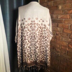 Lightweight, open-front poncho features a brown cheetah print with metallic threading detail and bottom fringe. (Could fit a small/Med)