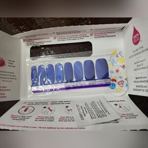 Main package has been opened in the back but the nail strips, nail prep pad, and nail file are in original packaging and have not been opened. A beautiful blue shimmer color of peel and stick 1 time use nail strips by Color Street.