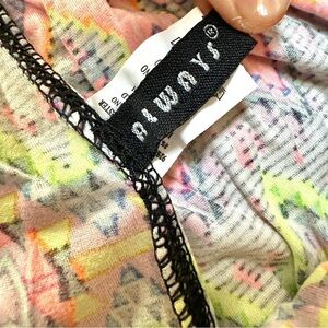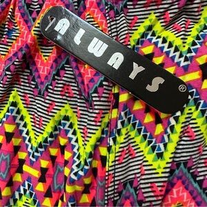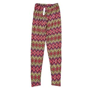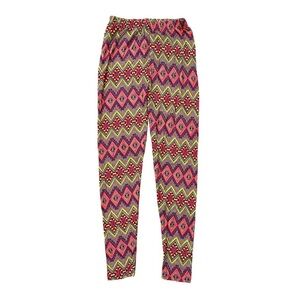 Vibrant leggings with a geometric pattern. Features pink, yellow, and purple colors.