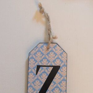 Lovely uppercase letter 'Z' small wood sign, Michael's Studio Decor 'Boho Modern' collection. This bright rustic letter sign features a blue & cream vintage-style wallpaper pattern background, has a twine loop at top for hanging, measures approx 5" tall x 2.5" wide, and is new with tags. A colorful birthday gift for Zoe, Zachary or Zara, or makes a great addition to your Fall home decor :)
