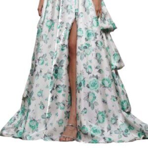 Product Details: Floral Printed, Strapless, Ruched, Pleated Bodice, High Slit, Tiered Skirt, Lace-Up Tie, Back Zipper