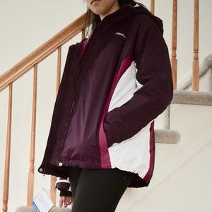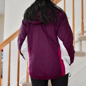 3-in-1 jacket able to be worn together or alone as a waterproof windbreaker or as a thin down coat. Will definitely keep you warm for outdoor activities! Jacket comes in a fun purple/magenta color and has a flattering silhouette. It's a little big on me because I normally wear a medium.