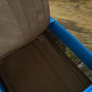 Men's brown Columbia Billfold/Bifold leather wallet new and unused in original blue gift box. Wallet has 9 card slots, 1 photo ID slot, and 1 slot for bills. Wallet measures at 4.25 inches wide by 3.5 inches tall.