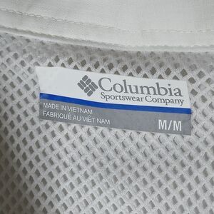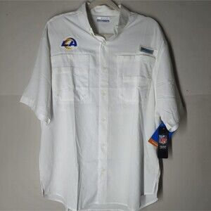 Show off your love for the Los Angeles Rams with this NWT Columbia PFG Shirt in size Medium. The shirt features a solid white color with an embroidered button-down collar and short sleeves. It is made of lightweight and breathable polyester material with UV protection and moisture-wicking technology, making it perfect for both travel and casual occasions.