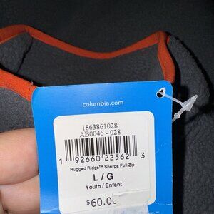Stay warm and fashionable with this brand new Columbia Rugged Ridge Sherpa Full Zip Jacket in size Youth Large. This jacket features a solid pattern and a gray and orange color combination, making it perfect for school and playing. The fleece/sherpa material will keep your child cozy, and the long sleeves and zip closure provide extra protection from the cold. Ideal for both boys and girls, this jacket is a must-have for any young adventurer.