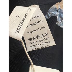 New with tags from commence this is a pearl trimmed black ribbed pullover sweater with a slim fit. Marked a large this has a minimal stretch and might be better on a medium. The neck line is trimmed with pearls and the snap cuffs also are trimmed with a pearl. This is very classy and pretty and brand new with tags. The website shows an original price around $50 this is 100% polyester to wash by hand.