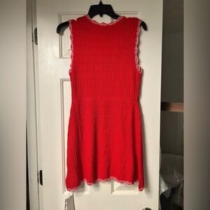 Chic red knit mini dress with button-down front. Sleeveless design with delicate lace trim. Perfect for versatile styling.