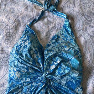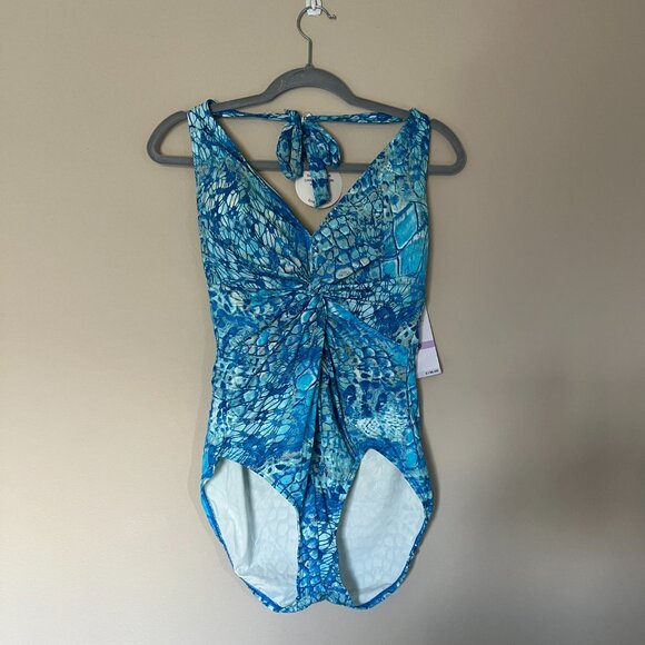 NWT Contours by Coco Reef Shapemaker Swimwear in cerulean blue, size 14/38. This beautiful swimsuit features a halter tie, molded cups and a knotted twist front detail.