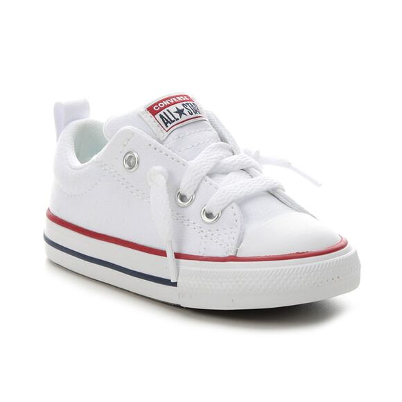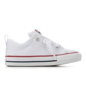 Keep little feet stylish with the Converse Chuck Taylor All Star Street Infant Sneaker. Featuring the iconic Chuck design in White/Navy, this unisex sneaker offers easy slip-on comfort with elastic laces and a secure fit. Size 8 Infant.