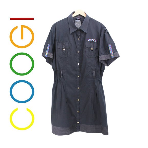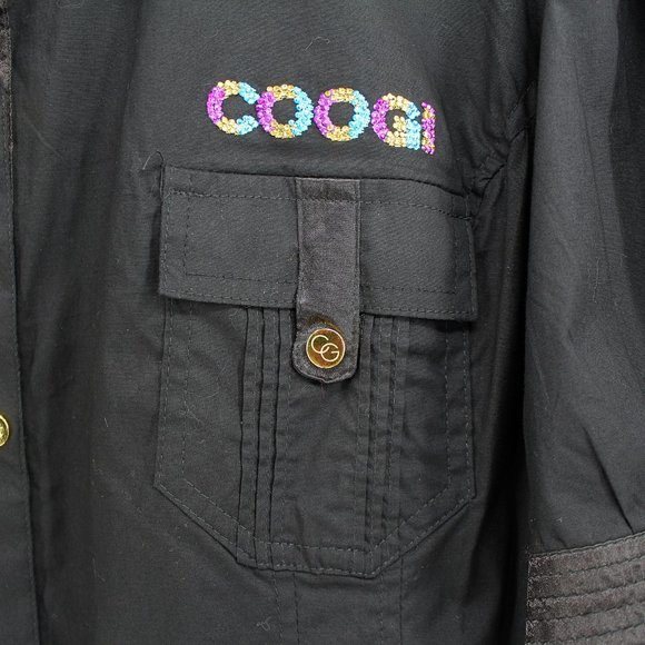 New with tags, and built for the bold. This Y2K-era Coogi shirt dress brings that signature hip-hop energy with rhinestone-embellished sleeve logos, satin trim, and gold-tone snap front. A puff-sleeve silhouette and elastic waist give it structured attitude, while the black cotton keeps it cool.