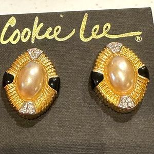 NWT Cookie Lee Earrings clip-on gold w/ black enamel, faux pearl & rhinestones