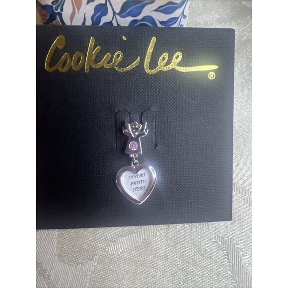 Up for sale is a Cookie Lee Pin new on the card. It is a cute angel with a pink cubic zirconia with a hanging heart shape photo frame. Please see all pictures