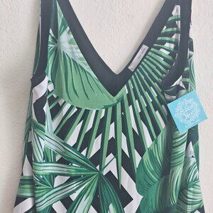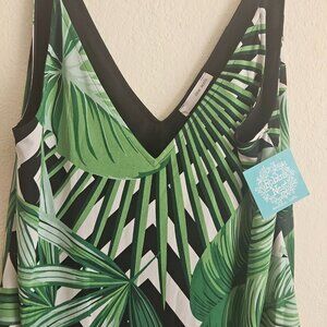 Very cute and stretchy mean neck spaghetti strap tank top / camisole with green Palm leaves all over and it's wrinkle resistant and lined. This will keep you very cool because it's lightweight and it would be great to take on a cruise or vacation.