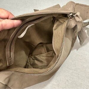 NWT Cooperative Suede Leather Shoulder Bag in olive, pockets, 2 side pocket, internal zip and slip pockets. Utility, Military