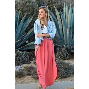 Our coral maxi skirt features a flattering A-line silhouette that skims the body and flows beautifully with every step. The elastic waistband provides a comfortable and customizable fit for all body types. The vibrant coral color is perfect for spring, and can easily be paired with a variety of tops and accessories.
