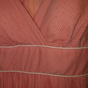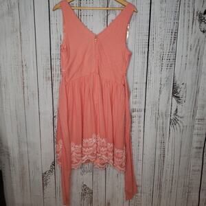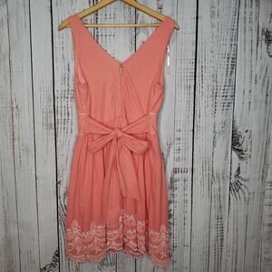 New with tags attached! Gorgeous knee length coral dress with embroidery around the edges. Size 11. Textured lightweight cotton material. V-neck. Thicker straps which are perfect for wearing a bra under. Tie-back or on front. Fully lined with built-in bra cups. From my smoke might be hard-free and pet-free home.