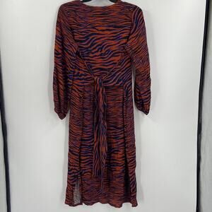 The Aviva dress is long sleeve dress with a convertible attached wrapping waist tie. The dress has a pretty blouson long sleeve and a v neck. It's a pull over style. Here is Zebra print fabric.