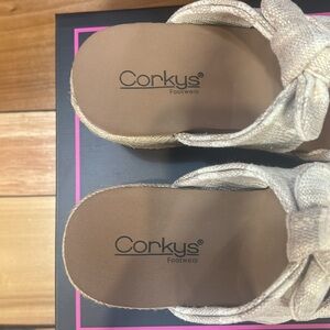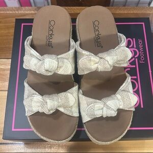 NEW Corkys Double Banded Tan Natural Stripe Tie the Knot Wedge Heel with Rope Detail on the Heel