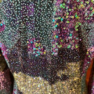 Dazzle in this vintage Coterie blazer, dripping in hand-stitched sequins and seed beads in a vibrant patchwork of iridescent greens, purples, teals, and silvers.