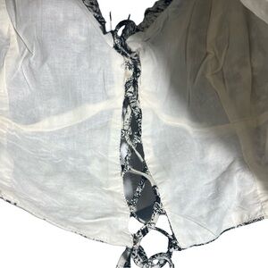 Cute Victorian print bustier top with lace up front and puffed short sleeves. Hidden side zipper. Can be worn on or off the shoulder.