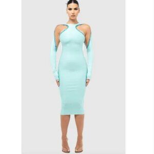 NWT CouCoo Necker Aqua Stretch Sequin Bodycon Open Shoulder Party Midi Dress S