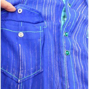 A denim-inspired shirt that brings rustic charm without the dust and cattle. This blue pinstripe number from Cowgirl Up offers a playful twist on western wear, complete with embroidered details and green metallic buttons that say "I'm here to wrangle some style".