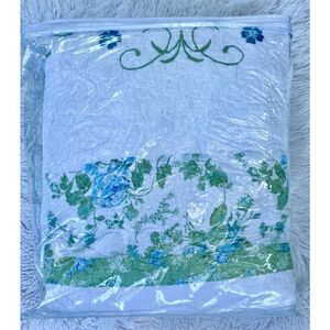 * White quilt with a beautiful blue and green embroidered floral design