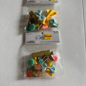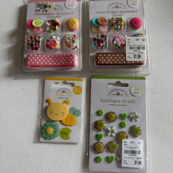 Super cute crafting embellishments from Queen and Company, Tim Holtz, etc. The BoBunny has two brads missing from the pack.