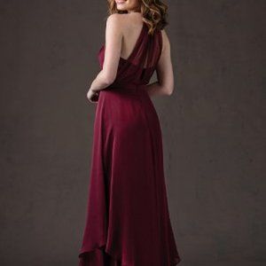 Chiffon bridesmaid dress with flattering halter neckline, pleated bodice, natural waistline and chiffon layered floor length skirt. Dress is also available in knee length.
