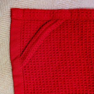 This is a SET of 2 holiday-themed waffle-weave dish towels from Crate & Barrel. The larger towel is a dish towel and measures 30.5 inches long x 21 inches wide, which is larger than a typical dish towel. It has a hanging loop in one corner (see photos). The smaller towel is the size of a large washcloth (15.5 inches long x 14 inches wide) and is a dish cloth. The embroidered and appliqued design is of a bear wearing an apron, with a mixing spoon stuck in the pocket, and holding a large gingerbread cookie. Color is a deep, bright red. Both towels are NWT; received as a present and never used. NOTE: There are no tags attached to these towels, but they are brand-new. 100% cotton. Machine washable. The waffle-weave material is designed to be absorbable and will soften with washing. NOTE: I have another set of these towels with a slightly different design. Please look in my closet for that listing.
