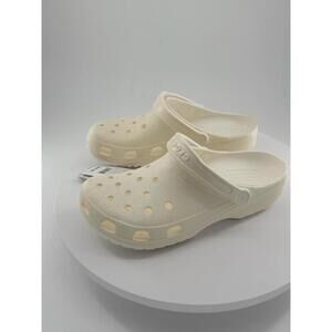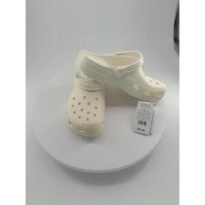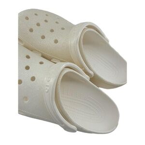 NWT Crocs Footwear Unisex M10 W12 Beige Glitter Classic SlipOn Ventilated Adjustable Heel Condition: New condition. Size: M10, W12 Material: 100% Synthetic Croslite™ Features: Slip-on, Ventilation holes, Adjustable heel strap Measurements: M10, W12 Tags: Crocs, Clog, Unisex, Summer, Lightweight, Beach, Travel, Casual, Comfort, Everyday