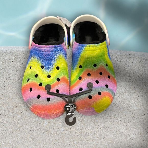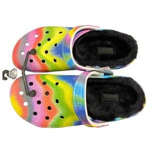 Crocs Classic Lined Clogs. The slip-on design and round toe shape make them perfect for travel and everyday wear, while the multicolor spray dye pattern adds a great pop of color. These clogs are suitable for any season, thanks to their synthetic upper material and fuzzy, breathable lining. Mens size 10 or Womens size 12.