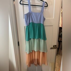 New with tags. Crosby by Mollie Burch Greta Tiered Dress. Size small. Pastel colorblock midi dress. Tiered design with gathered detailing and tie front panels. Left side seam zipper with hook and eye closure.