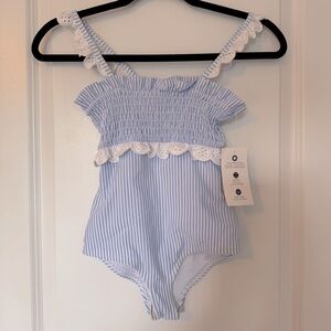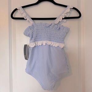 Adorable kids Crown & Ivy one piece swimsuit featuring a charming blue and white striped design. Eyelet trim and smocked around top. Perfect for fun days at the pool or beach.