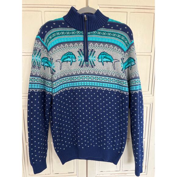 New with tags Crown and Ivy mens sweater with fish. Gray with teal and navy. Measures 22” from armpit to armpit and 29” long.