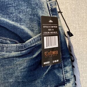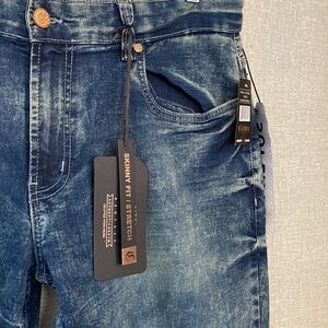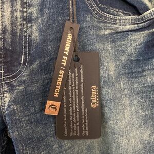 NWT Cultura New York Color Distressed Skinny Fit Stretch Jeans Size 36x32 Premium denim. Whiskering in front Dark wash with color distressing. 91% Cotton 17% Polyester 2% Lycra Flat lay measured waist 18" Rise 10" Inseam 32"